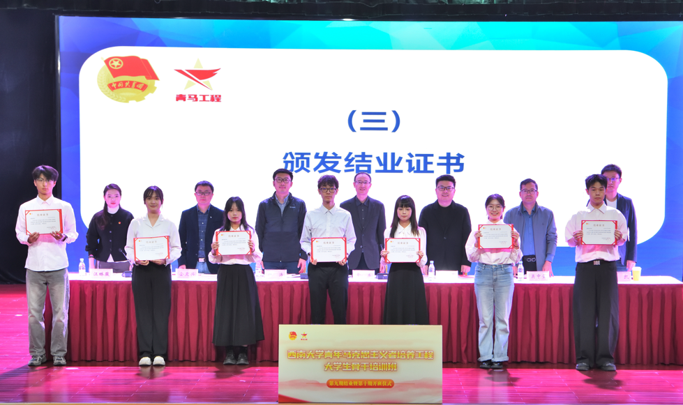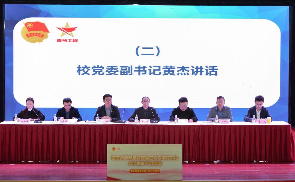 为深入学习贯彻习近平新时代中国特色社会主义思想,以及党的二十大和二十届三中、四中全会精神,认真贯彻落实习近平总书记关于青年工作的重要思想和习近平总书记关于教育的重要论述,10月24日,学校青年马克思主义者培养工程(简称“青马工程”)大学生骨干培训班第九期结业暨第十期开班仪式在圆顶三楼报告厅顺利举行。学校党委副书记黄杰,以及党委组织部、党委宣传部、党委学生工作部、马克思主义学院、团委相关负责同志出席仪式,校级“青马工程”相关负责同志、院级“青马工程”相关负责同志(二级团组织书记)、校级“青马工程”第十期全体学员、第九期优秀学员代表以及院级“青马工程”本期学员代表共同参会。