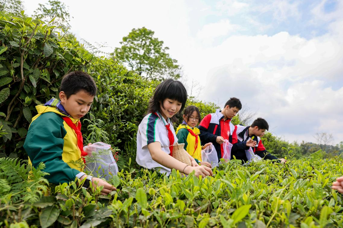 活动现场,师生们坚持理论学习与躬身实践相统一。在代家村春茶种植基地,茶农现场指导同学们学习“一芽一叶”的采摘标准与手法技巧。在姬松茸种植基地,同学们清扫美化基地环境,并协助采摘姬松茸,深入了解特色菌菇的种植周期、生长习性及市场前景。实践过程中,大、中、小学生分组协助,亲身参与采茶劳作,深刻体会传统农耕的内涵与价值,系统学习体会了乡村特色产业助力增收的实践路径。
